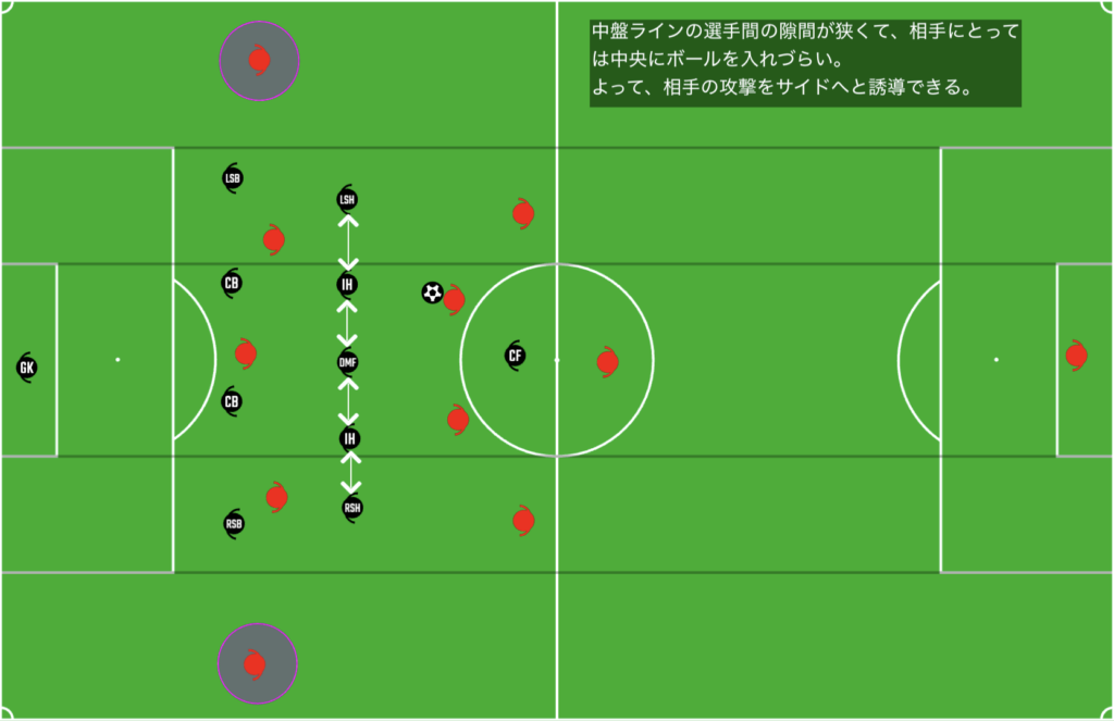 相手の左右に揺さぶる攻撃を受けても、中盤が5人なのでスライドがとてもスムーズに行うことができる。