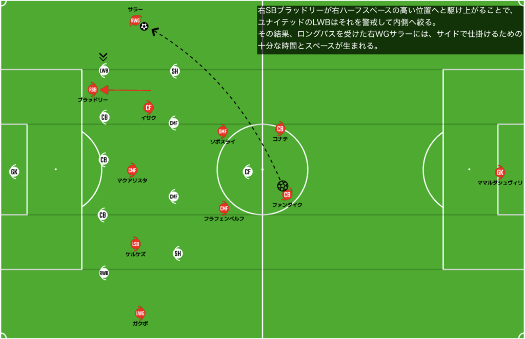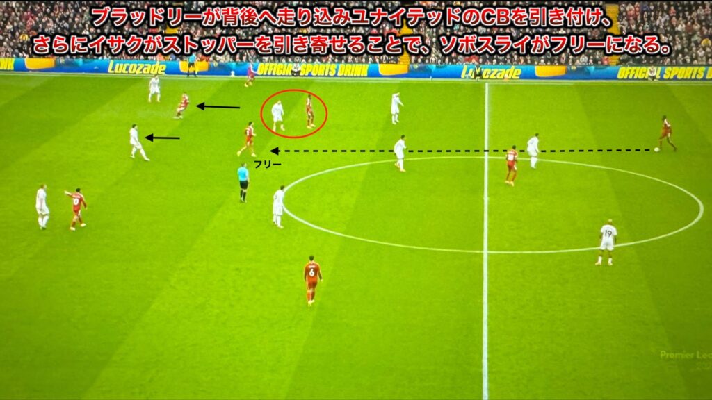 【写真①】のように、イサクがIHを引きつけ、ブラッドリーがその裏へ走り込むことで、ユナイテッドのCBマグワイアを下げさせ、ソボスライをフリーにしている。