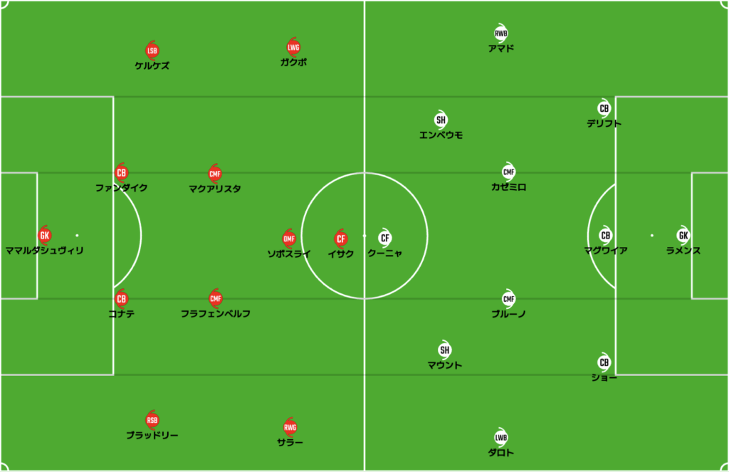前半開始早々、マクアリスタとファン・ダイクがかぶるアクシデントが生じ、早い時間帯にユナイテッドへ先制を許した。